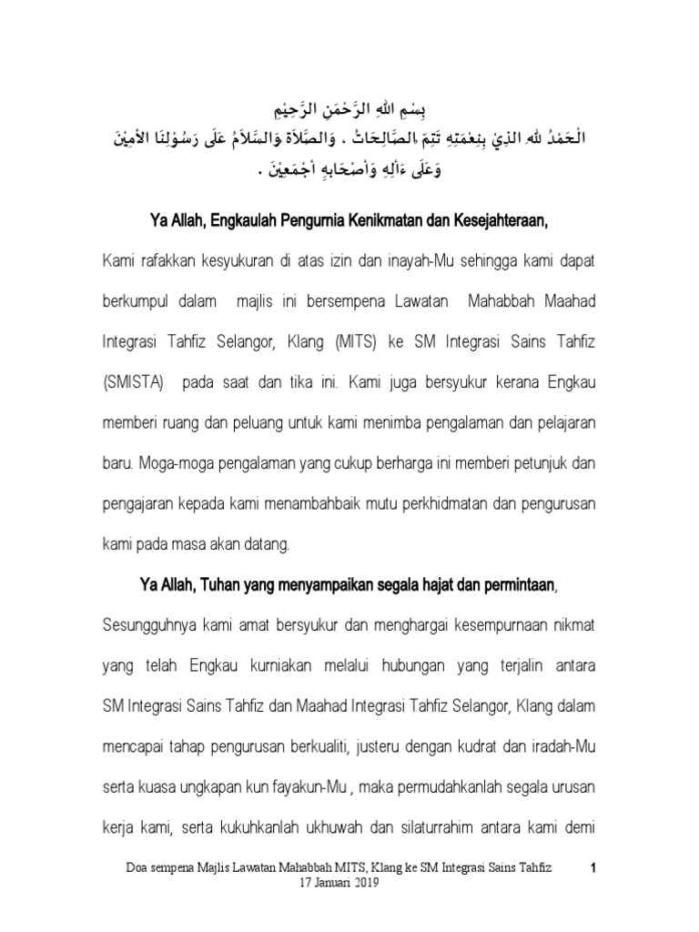 Doa Lawatan Kerja : Teks doa lawatan pengarah pelajaran selangor بِسْمِ اللهِ الرَّحْمَنِ الرَّحِيْمِ اَلْحَمْدُ text of teks doa lawatan pengarah.